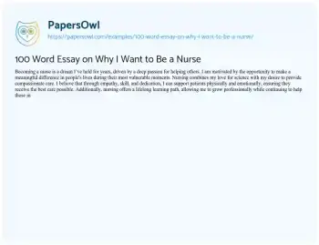 100 Word Essay on Why I Want to Be a Nurse. (2025, Jul 29). Retrieved from https://hub.papersowl.com/examples/100-word-essay-on-why-i-want-to-be-a-nurse/