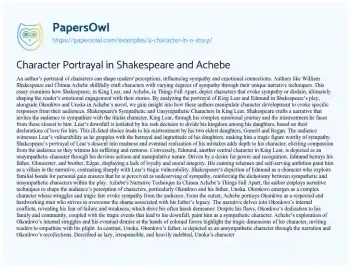 An author’s portrayal of characters can shape readers' perceptions, influencing sympathy and emotional connections. Authors like William Shakespeare and Chinua Achebe skillfully craft characters with varying degrees of sympathy through their unique narrative techniques. This essay examines how Shakespeare, in King Lear, and Achebe, in Things Fall Apart, depict characters that evoke sympathy or disdain, ultimately shaping the reader’s emotional engagement with their stories. By analyzing the portrayal of King Lear and Edmund in Shakespeare’s play, alongside Okonkwo and Unoka in Achebe’s novel, we gain insight into how these authors manipulate character development to evoke specific responses from their audiences.