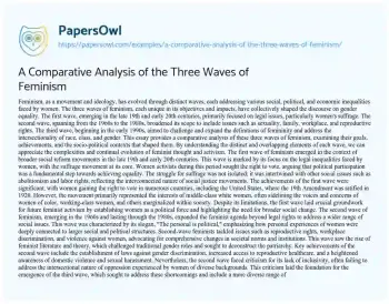 The third wave, beginning in the early 1990s, aimed to challenge and expand the definitions of femininity and address the intersectionality of race, class, and gender. This essay provides a comparative analysis of these three waves of feminism, examining their goals, achievements, and the socio-political contexts that shaped them. By understanding the distinct and overlapping elements of each wave, we can appreciate the complexities and continual evolution of feminist thought and activism.