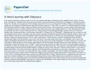 This essay about Odysseus as depicted in Homer’s “The Odyssey” examines how his narrative aligns with Joseph Campbell’s Hero’s Journey. It details Odysseus’s initial call to adventure, which begins with his participation in the Trojan War, followed by his arduous return home. This return, marked by a series of challenges and transformations, showcases key stages of the Hero’s Journey, including Crossing the First Threshold, encountering Tests, Allies, Enemies, and undergoing a profound Ordeal in the underworld. The essay highlights how these experiences equip Odysseus with the wisdom needed for his ultimate return to Ithaca, where he must reclaim his throne. His journey illustrates not only a physical return but a deep personal transformation, embodying the essence of the Hero’s Journey and its relevance to personal growth and understanding. Through Odysseus’s trials, the narrative invites reflection on the broader human experience of overcoming obstacles and achieving profound personal insight.