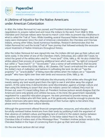 A Lifetime of Injustice for the Native Americans under American Colonization. (2019, Jan 23). Retrieved from https://hub.papersowl.com/examples/a-lifetime-of-injustice-for-the-native-americans-under-american-colonization/