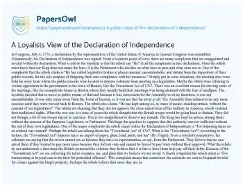 This essay will offer a perspective on the Declaration of Independence from the standpoint of a Loyalist during the American Revolution. It will discuss the reasons why Loyalists opposed the Declaration, including their loyalty to the British Crown, their views on colonial rebellion, and their concerns about the potential consequences of independence. Also at PapersOwl you can find more free essay examples related to Declaration Of Independence.