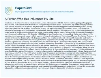 In conclusion, the influence of a mentor like Dr. Carter is a powerful testament to the profound impact that individuals can have on our lives. Her mentorship has been a guiding force, shaping my personal and professional journey through her unwavering support and insightful guidance. The lessons imparted have not only equipped me with the skills necessary to navigate the complexities of life but have also instilled in me a commitment to ethical and intellectual rigor. As I continue to forge my path, the legacy of Dr. Carter's mentorship remains a cornerstone of my identity, underscoring the transformative power of guidance and inspiration in shaping one's life. The indelible mark she has left on my life is a reminder of the profound influence that one individual can have, inspiring future generations to seek and provide mentorship in their own journeys.
