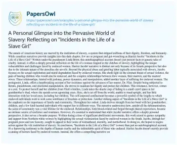 A Personal Glimpse into the Pervasive World of Slavery: Reflecting on "Incidents in the Life of a Slave Girl". (2023, Dec 04). Retrieved from https://hub.papersowl.com/examples/a-personal-glimpse-into-the-pervasive-world-of-slavery-reflecting-on-incidents-in-the-life-of-a-slave-girl/