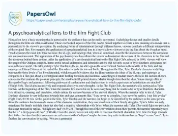This essay will provide a psychoanalytical analysis of the film “Fight Club.” It will explore themes of identity, the unconscious mind, and the manifestation of the narrator’s psychological conflicts. The piece will discuss how psychoanalytic theories, such as those of Freud and Jung, can be applied to understand the characters’ motivations and the film’s narrative. At PapersOwl too, you can discover numerous free essay illustrations related to Fight Club.