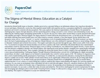 The Stigma of Mental Illness: Education as a Catalyst for Change. (2023, Jun 18). Retrieved from https://hub.papersowl.com/examples/a-reflection-on-mental-health-awareness-and-overcoming-stigma/