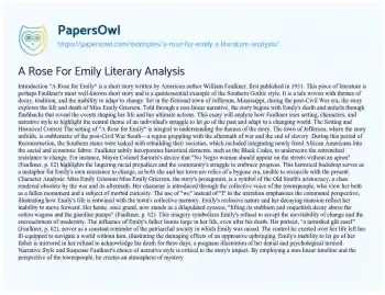 This essay will offer a literary analysis of William Faulkner’s “A Rose for Emily.” It will discuss the narrative structure, themes of decay and resistance to change, and the symbolism in the story. The piece will analyze the character of Emily Grierson and the societal and psychological factors that shape her life and actions. Additionally, PapersOwl presents more free essays samples linked to A Rose For Emily.