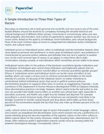 A Simple Introduction to Three Main Types of Racism. (2020, Mar 15). Retrieved from https://hub.papersowl.com/examples/a-simple-introduction-to-three-main-types-of-racism/