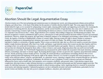 Abortion remains one of the most polarizing and contentious issues in contemporary society, provoking passionate debates across political, religious, and ethical lines. At the heart of the debate lies the question of whether abortion should be legal. This essay argues that abortion should indeed be legal, as it is essential for safeguarding women's rights, ensuring public health, and supporting social justice. By examining the implications of restricting abortion, the moral considerations, and the societal benefits of legal abortion, this essay aims to underscore the necessity of preserving a woman's right to choose.