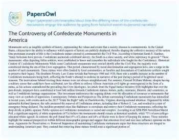 The Controversy of Confederate Monuments in America. (2022, Aug 19). Retrieved from https://hub.papersowl.com/examples/about-how-the-differing-views-of-the-confederate-monuments-engage-the-audience-by-going-from-historical-events-to-personal-narratives/