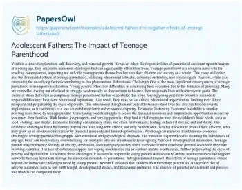 This essay about the negative effects of teenage fatherhood explores how the responsibilities of parenthood at a young age can derail educational pursuits, lead to economic instability, and cause emotional and psychological stressors for adolescent fathers. It highlights the intergenerational implications of teenage fatherhood and the underlying social and structural factors contributing to this phenomenon. The essay also emphasizes the importance of comprehensive sex education, supportive environments for young fathers, and targeted interventions to address these challenges and promote healthier outcomes for teenage parents and their families.