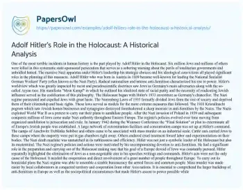 This essay about Adolf Hitler’s role in the Holocaust examines his influence in orchestrating the genocide of six million Jews and millions of others during World War II. It traces Hitler’s rise to power fueled by virulent anti-Semitism and a radical nationalist agenda and explores how his ideological convictions and strategic decisions led to the systemic persecution and extermination of Jews. The essay highlights the implementation of oppressive laws the escalation of violence and the establishment of extermination camps under Hitler’s directives. It also acknowledges the complicity of various individuals and groups in facilitating the genocide. The essay underscores the importance of understanding this dark chapter in history to prevent future atrocities.