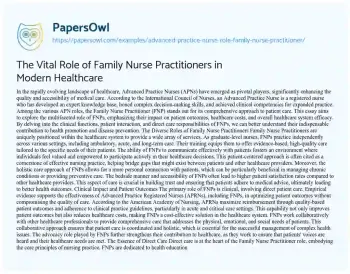 The Vital Role of Family Nurse Practitioners in Modern Healthcare. (2020, Jan 03). Retrieved from https://hub.papersowl.com/examples/advanced-practice-nurse-role-family-nurse-practitioner/