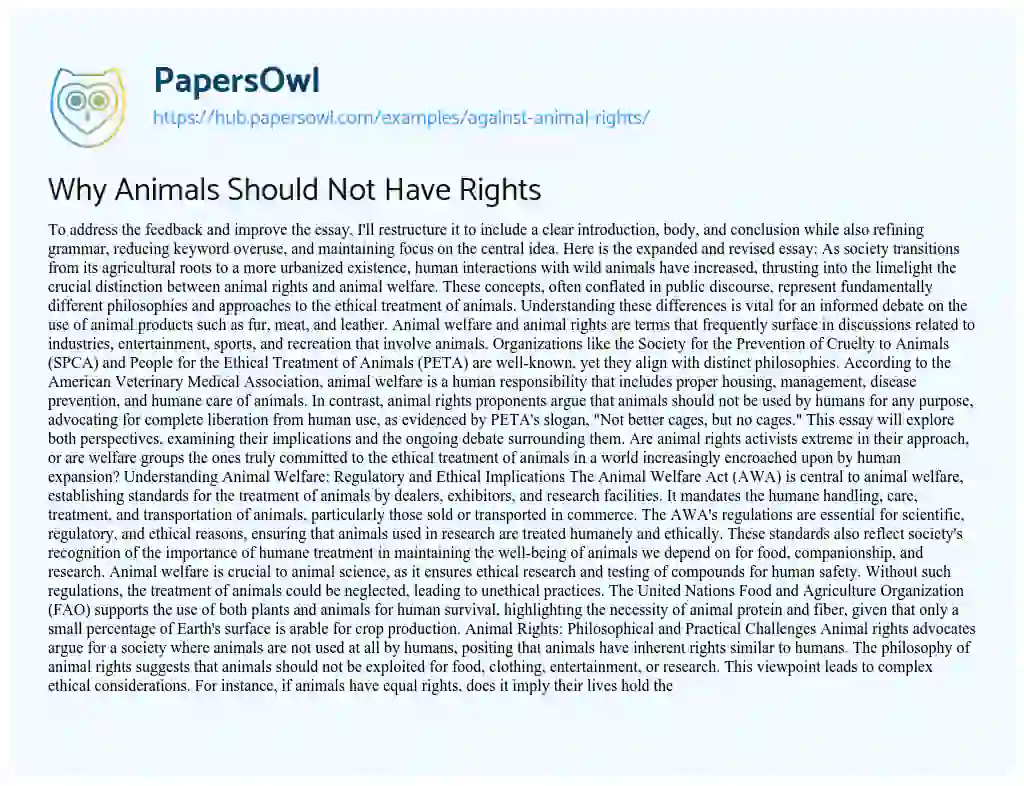 This revised essay addresses the feedback by providing a structured format with a clear introduction, body, and conclusion. It corrects grammatical errors, reduces keyword repetition, and maintains focus on the central theme of distinguishing between animal rights and animal welfare, ensuring a coherent and persuasive argument.