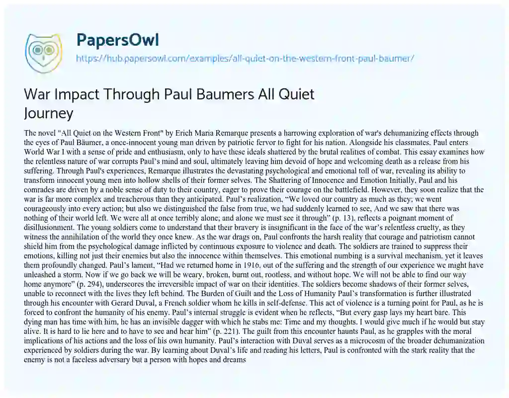 War Impact Through Paul Baumers All Quiet Journey. (2021, Jun 16). Retrieved from https://hub.papersowl.com/examples/all-quiet-on-the-western-front-paul-baumer/