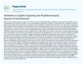 This essay delves into the multifaceted concept of “ambiente,” a term rooted in Spanish and Italian, and its translation into English as “environment.” Beyond its basic ecological meaning, the essay explores ambiente’s broader implications, including its cultural, social, and emotional dimensions. It examines how ambiente encompasses not only physical surroundings but also the atmospheres and vibes of different settings, impacting human experiences and emotions. The discussion extends to the influence of ambiente on behavior and societal norms, and its presence in both physical and virtual spaces. Additionally, the essay touches on the psychological aspect of ambiente, highlighting its significance in mental health and emotional well-being. The essay concludes by emphasizing ambiente’s role in literature and the arts, where it sets tone and evokes emotions, illustrating its ability to transcend physicality and shape our experiences, relationships, and identities. This exploration offers a nuanced understanding of the term ambiente in an English-speaking context, revealing its depth and complexity beyond a mere translation. At PapersOwl, you’ll also come across free essay samples that pertain to English