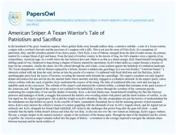 American Sniper: A Texan Warrior's Tale of Patriotism and Sacrifice. (2024, Feb 20). Retrieved from https://hub.papersowl.com/examples/american-sniper-a-texan-warriors-tale-of-patriotism-and-sacrifice/