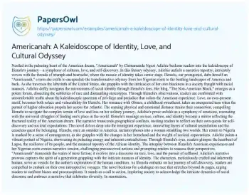 Americanah: A Kaleidoscope of Identity, Love, and Cultural Odyssey. (2024, Feb 20). Retrieved from https://hub.papersowl.com/examples/americanah-a-kaleidoscope-of-identity-love-and-cultural-odyssey/