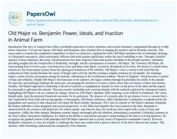 This essay examines the roles and symbolism of Old Major and Benjamin in George Orwell’s “Animal Farm.” It will explore how Old Major’s character ignites the spark of rebellion with his ideology, while Benjamin’s cynicism represents skepticism and passive resistance. The piece will analyze their influence on the other animals and the overarching narrative, considering how these characters reflect different aspects of society and revolution. This essay aims to offer insights into Orwell’s critique of political movements and societal dynamics through these pivotal characters. PapersOwl showcases more free essays that are examples of Animal Farm.