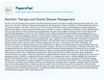 In today's world, the interplay between nutrition and chronic disease has become a focal point of health research and public health policy. This essay reviews the article, “Nutrition Therapy Recommendations for the Management of Adults with Diabetes,” which systematically examines 228 articles and studies on the subject. The decision to review this article stems from an interest in understanding how nutrition specifically impacts chronic diseases, which are among the leading causes of mortality in America, as identified by the National Center for Health Statistics.