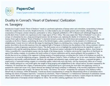 Duality in Conrad's 'Heart of Darkness': Civilization vs. Savagery. (2021, Jul 05). Retrieved from https://hub.papersowl.com/examples/analysis-of-heart-of-darkness-by-joseph-conrad/