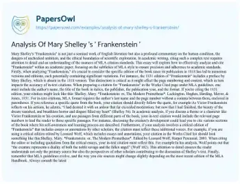 This essay about the nuances of citing “Frankenstein” by Mary Shelley in MLA format explores effective citation practices for academic writing. It highlights the importance of considering the edition of the book used due to variations in content and pagination, which can affect the accuracy of in-text citations. For example, citations for the 1831 edition are differentiated from other versions to ensure precise referencing. The essay also discusses the inclusion of critical editions that contain essays and annotations by other scholars, demonstrating how to attribute these sources properly in both the Works Cited page and in-text citations. The focus is on maintaining rigorous standards in citation to enhance readability, ensure academic integrity, and facilitate further research on Shelley’s work.