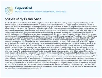 Theodore Roethke's poem "My Papa's Waltz" has long been a subject of critical analysis, inviting diverse interpretations that range from the innocent nostalgia of childhood to the darker themes of domestic violence and dysfunction. As a diligent student of literature, it is crucial to approach this poem with a discerning eye, examining its nuances, language, and imagery to unravel its complexities and derive a comprehensive understanding.