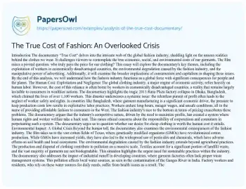 The True Cost of Fashion: An Overlooked Crisis. (2022, Jun 23). Retrieved from https://hub.papersowl.com/examples/analysis-of-the-true-cost-documentary/