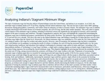 This essay aims to explore various aspects of the minimum wage in Indiana, including its historical context, the arguments for and against its increase, and its potential impacts on the state's economy and workforce. Through a comprehensive analysis, this essay will highlight the complexities surrounding the minimum wage issue in Indiana and propose considerations for future policy decisions.