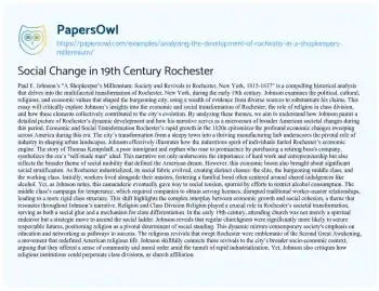 Paul E. Johnson’s "A Shopkeeper’s Millennium: Society and Revivals in Rochester, New York, 1815-1837" is a compelling historical analysis that delves into the multifaceted transformation of Rochester, New York, during the early 19th century. Johnson examines the political, cultural, religious, and economic values that shaped the burgeoning city, using a wealth of evidence from diverse sources to substantiate his claims. This essay will critically explore Johnson’s insights into the economic and social transformation of Rochester, the role of religion in class division, and how these elements collectively contributed to the city’s evolution.