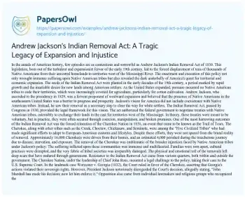 Andrew Jackson's Indian Removal Act: A Tragic Legacy of Expansion and Injustice. (2024, May 21). Retrieved from https://hub.papersowl.com/examples/andrew-jacksons-indian-removal-act-a-tragic-legacy-of-expansion-and-injustice/