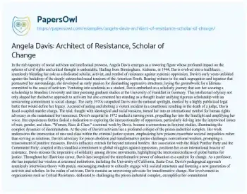 Angela Davis: Architect of Resistance, Scholar of Change. (2024, Feb 20). Retrieved from https://hub.papersowl.com/examples/angela-davis-architect-of-resistance-scholar-of-change/