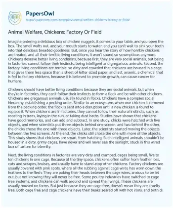 Animal Welfare, Chickens: Factory Or Field. (2022, Aug 17). Retrieved from https://hub.papersowl.com/examples/animal-welfare-chickens-factory-or-field/