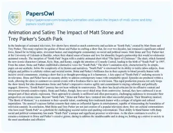 Animation and Satire: The Impact of Matt Stone and Trey Parker's South Park. (2023, Dec 28). Retrieved from https://hub.papersowl.com/examples/animation-and-satire-the-impact-of-matt-stone-and-trey-parkers-south-park/