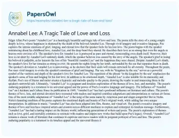 In conclusion, Edgar Allan Poe's "Annabel Lee" is a powerful and poignant exploration of love, loss, and eternal devotion. Through vivid imagery and evocative language, Poe captures the intense emotions of grief and longing that the speaker feels for his lost love. The poem's enduring popularity and influence on literature and culture are a testament to its universal appeal and the timeless themes it explores. "Annabel Lee" remains a classic work of literature that continues to captivate and move readers with its haunting beauty and tragic tale of love and loss.
