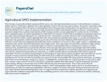 Agricultural GMO Implementation. (2020, Feb 21). Retrieved from https://hub.papersowl.com/examples/are-gmo-foods-better-than-organic-foods/