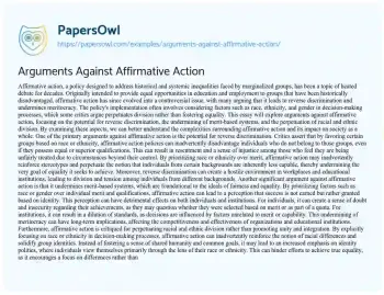 This essay will explore arguments against affirmative action, focusing on the potential for reverse discrimination, the undermining of merit-based systems, and the perpetuation of racial and ethnic division. By examining these aspects, we can better understand the complexities surrounding affirmative action and its impact on society as a whole.