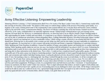 This essay will discuss the importance of effective listening in military leadership. It will explore how active listening skills can enhance command efficacy, improve team dynamics, and foster a respectful environment. The piece will provide insights into the application of listening skills in the Army. Additionally, PapersOwl presents more free essays samples linked to Cognition.