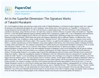 Art in the Superflat Dimension: The Signature Works of Takashi Murakami. (2023, Dec 01). Retrieved from https://hub.papersowl.com/examples/art-in-the-superflat-dimension-the-signature-works-of-takashi-murakami/