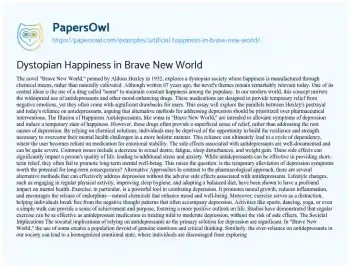 This essay will explore the parallels between Huxley's portrayal and today's reliance on antidepressants, arguing that alternative methods for addressing depression should be prioritized over pharmaceutical interventions.