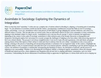 This essay delves into the multifaceted concept of “assimilate” within the realm of sociology. It unravels the intricate dynamics of assimilation, exploring how individuals and groups adapt to new cultures and societies while preserving elements of their own identity. From the challenges faced by immigrants to the choices made in the process of integration, this essay sheds light on the sociological dimensions of assimilation. It also delves into the broader significance of assimilation, touching on its relevance in understanding human interactions, cultural diversity, and societal change. “Assimilate in Sociology” offers a comprehensive perspective on the evolving nature of assimilation and its profound impact on the fabric of societies worldwide. You can also find more related free essay samples at PapersOwl about Sociology.