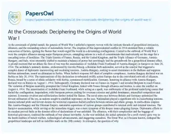 This essay about the origins of World War I unravels the complex tapestry of geopolitical intricacies, alliances, and nationalistic fervor that ignited the cataclysmic conflict in 1914. Fueled by a volatile mix of factors, including the assassination of Archduke Franz Ferdinand, imperial ambitions, and the intricate web of alliances among major European powers, the war unfolded as a devastating conflagration. The essay explores how the geopolitical domino effect, exacerbated by nationalism, militarization, and economic rivalries, led to a cascade of hostilities across the continent. As the war unfolded, optimism for a swift victory gave way to the harsh realities of trench warfare and staggering casualties, ultimately reshaping the geopolitical landscape and leaving an indelible mark on the 20th century. The examination of the war’s intricate origins sheds light on the convergence of historical, political, and socio-economic factors that marked it as a pivotal moment in history. Additionally, PapersOwl presents more free essays samples linked to World War 1.