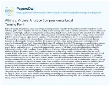 This essay about Atkins v. Virginia highlights a pivotal moment in American legal history where the Supreme Court’s decision reshaped perceptions of justice for individuals with intellectual disabilities. Focusing on Daryl Renard Atkins’ case, convicted of capital murder despite his cognitive limitations, the essay underscores the ethical debate surrounding the execution of intellectually disabled individuals. Through a compelling narrative, it explores the Court’s landmark ruling in June 2002, which declared such executions unconstitutional under the Eighth Amendment. The essay examines the broader societal impact, including revisions to state laws and increased advocacy for disability rights. It reflects on the enduring power of empathy and compassion in shaping legal principles and calls for a future where justice is inclusive and humane.