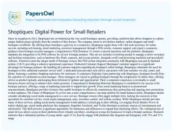 Shoptiques: Digital Power for Small Retailers. (2022, Feb 09). Retrieved from https://hub.papersowl.com/examples/attracting-attention-through-social-networks/