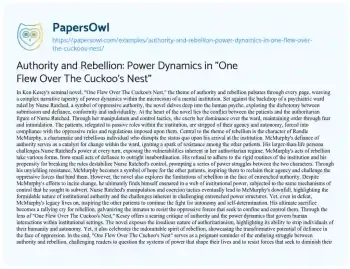 This essay about Ken Kesey’s “One Flew Over The Cuckoo’s Nest” explores the theme of authority and rebellion within the confines of a mental institution. Focused on the power dynamics between the oppressive Nurse Ratched and the rebellious Randle McMurphy, it into the struggle for autonomy and individuality amidst institutional control. McMurphy’s defiance serves as a beacon of hope for the other patients, inspiring them to resist the constraints imposed upon them. However, the narrative also reveals the limitations of rebellion in the face of entrenched authority, culminating in McMurphy’s ultimate sacrifice. Through its exploration of authoritarianism and resistance, the essay provides a thought-provoking analysis of human nature and the enduring struggle for freedom within institutional settings.