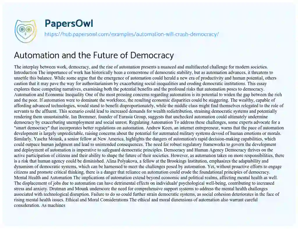 Automation and the Future of Democracy. (2020, Mar 20). Retrieved from https://hub.papersowl.com/examples/automation-will-crash-democracy/