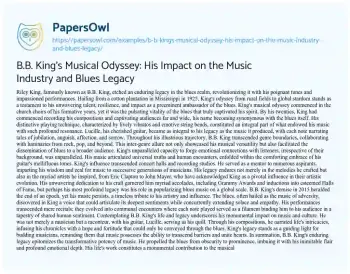 B.B. King's Musical Odyssey: His Impact on the Music Industry and Blues Legacy. (2024, Mar 25). Retrieved from https://hub.papersowl.com/examples/b-b-kings-musical-odyssey-his-impact-on-the-music-industry-and-blues-legacy/