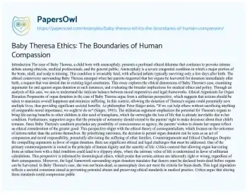 This essay explores the ethical dimensions of Baby Theresa's case, examining arguments for and against organ donation in such instances, and evaluating the broader implications for medical ethics and policy. Through an analysis of this case, we aim to understand the intricate balance between moral imperatives and legal frameworks.