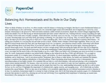 This essay explores the concept of homeostasis, a fundamental process by which our bodies maintain a stable internal environment. It begins by defining homeostasis in an accessible manner, likening it to an internal thermostat and cruise control that work in harmony. The essay then illustrates this concept with everyday examples: how our bodies regulate temperature through sweating, maintain fluid balance through thirst, and control blood sugar levels through the release of insulin and glucagon. Beyond physical processes, it also touches on the psychological aspect of homeostasis, such as how we naturally seek to reduce stress. The essay underscores the complexity of this balancing act, highlighting its role in various bodily functions and its importance in maintaining overall health. It also briefly discusses what happens when homeostasis is disrupted, leading to various health issues. Concluding on a reflective note, the piece emphasizes the interconnectedness of our bodily systems and the importance of lifestyle choices in supporting homeostasis. This engaging narrative not only demystifies a scientific concept but also connects it to everyday life, emphasizing its significance in our daily well-being. At PapersOwl, you’ll also come across free essay samples that pertain to Homeostasis.