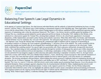 This essay about the Tinker v. Des Moines cases (1969) explores the intricate interplay between individual liberties and the authority of educational institutions in American legal history. Set against the backdrop of the Vietnam War era, the narrative into the silent protest by students, wearing black armbands, which triggered a legal battle reaching the Supreme Court. The landmark decision established that students and teachers retain their constitutional rights to free speech within schools, with limitations only in cases of substantial disruption. The essay traces the legal evolution through subsequent cases like Bethel School District v. Fraser (1986) and Morse v. Frederick (2007), highlighting the ongoing tension between safeguarding students’ rights and maintaining a disciplined learning environment. As the legal landscape continues to evolve, this essay underscores the enduring relevance of Tinker v. Des Moines and its impact on the boundaries of free speech in American education. Also at PapersOwl you can find more free essay examples related to Law.